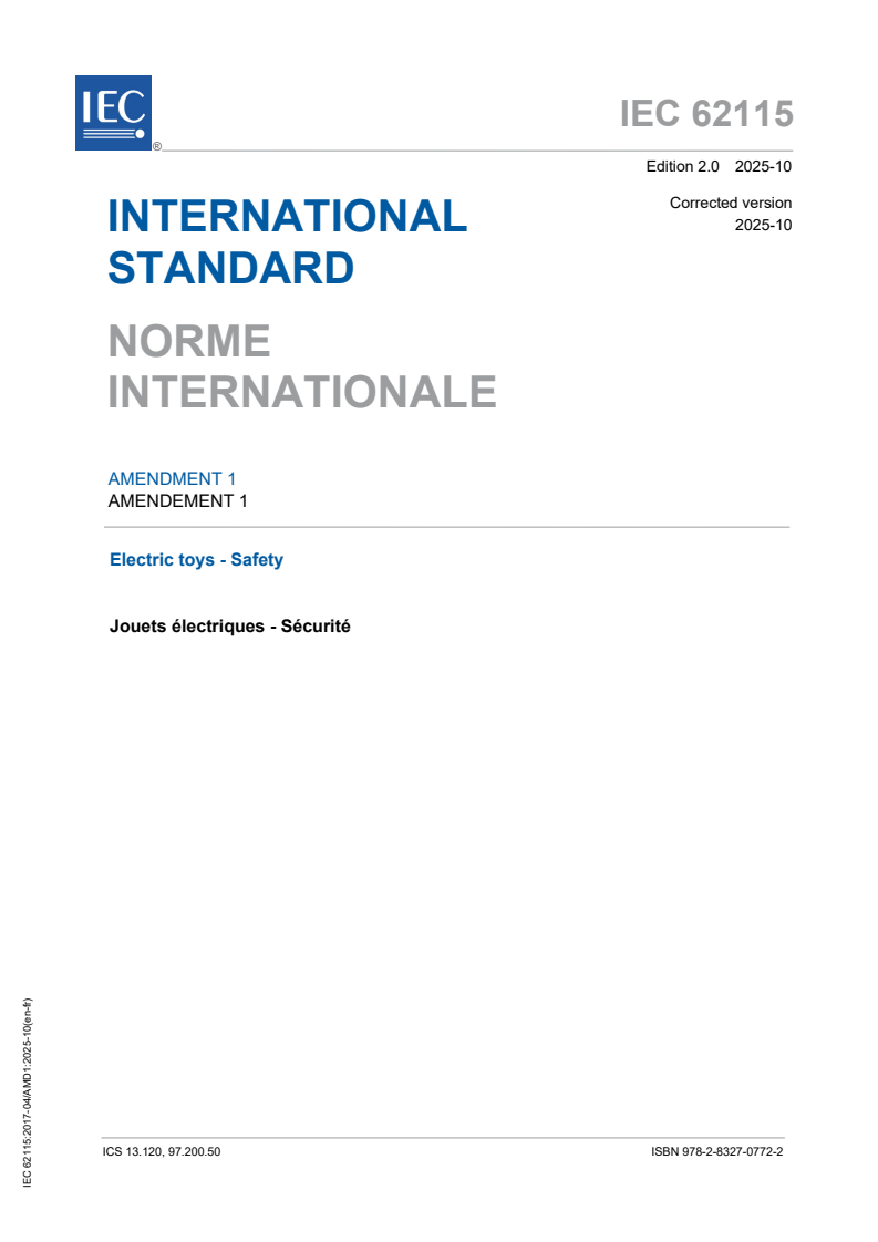 IEC 62115:2017/AMD1:2025 - Amendment 1 - Electric toys - Safety Released:10/21/2025 Isbn:9782832707722