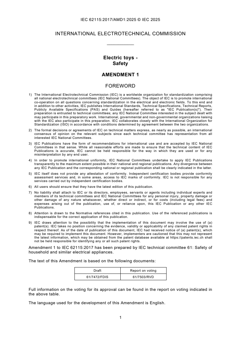 IEC 62115:2017/AMD1:2025 is a standard published by the International Electrotechnical Commission (IEC). Its full title is "Amendment 1 - Electric toys - Safety". This standard covers: The content of the corrigendum 1 (2025-10) has been included in this copy.