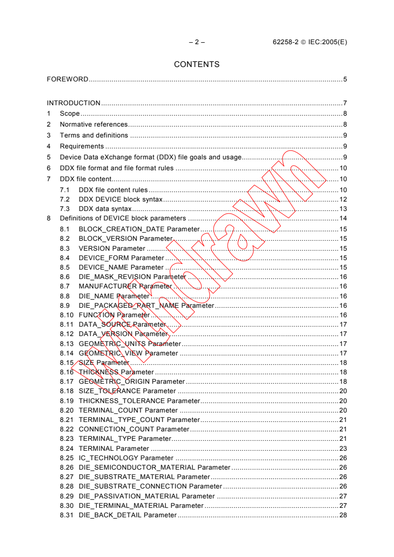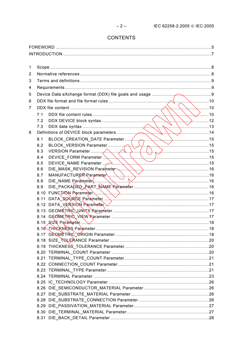IEC 62258-2:2005 - "Semiconductor die products - Part 2: Exchange data formats" defines standardized data formats to support the production, supply and use of semiconductor die products (wafers, singulated bare die, bumped die, partially encapsulated die, etc.). The standard introduces the Device Data eXchange (DDX) format (reflected as DDX version 1.2.1) and describes how DDX and related file formats (for example STEP physical file format / ISO 10303-21 and XML) can be used to transfer geometric data and device metadata between die manufacturers and CAD/CAE users. The format is intentionally flexible to permit broader usage beyond the initial scope.