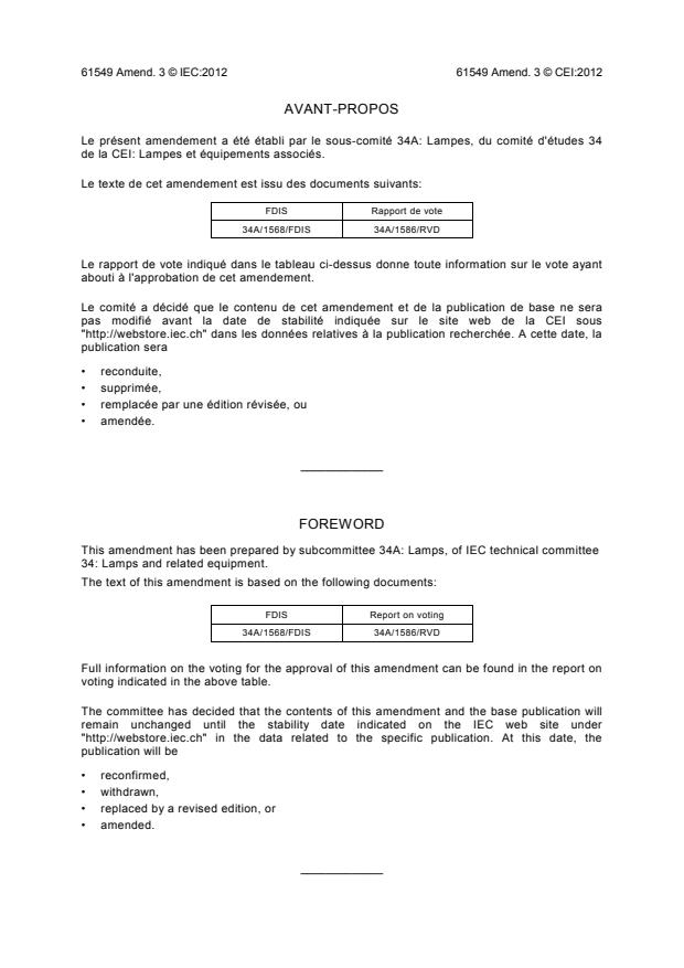 IEC 61549:2003/AMD3:2012 is a standard published by the International Electrotechnical Commission (IEC). Its full title is "Amendment 3 - Miscellaneous lamps". This standard covers: Amendment 3 - Miscellaneous lamps