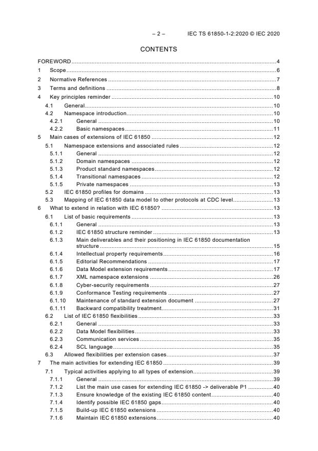 IEC TS 61850-1-2:2020, which is a technical specification, is intended for any users but primarily for standardization bodies that are considering using IEC 61850 as a base standard within the scope of their work and are willing to extend it as allowed by the IEC 61850 standards. This document identifies the required steps and high-level requirements in achieving such extensions of IEC 61850 and provides guidelines for the individual steps. Within that scope, this document addresses the following cases: • The management of product-level standards for products that have an interface based on IEC 61850 • The management of domain-level standards based on IEC 61850 • The management of transitional standards based on IEC 61850 • The management of private namespaces based on IEC 61850 • The development of standards offering the mapping of IEC 61850 data model at CDC level • The development and management of IEC 61850 profiles for domains (underlying the role of IEC TR 62361-103 and IEC TR 61850-7-6) This document includes both technical and process aspects: On the technical side, this document: • Reminds the main basic requirements (mostly referring to the appropriate parts of the series which host the requirements or recommendations) • Lists all possible flexibilities offered by the standards • Defines which flexibilities are allowed/possible per type of extension cases On the process side, the document covers: • The initial analysis of how the existing IEC 61850 object models and/or communication services may be applied and what allowed extensions may be required for utilizing them in new or specific domains (including private ones). The results of that step are expected to be documented • The extension of the IEC 61850 object models for new domains. The typical associated work is to identify existing logical nodes which can be reused "as is", to determine if existing logical nodes can be extended, or to define new logical nodes • The purpose and process to use transitional namespaces, which are expected to be merged eventually into an existing standard namespace • The management of standard namespaces • The development of private namespaces