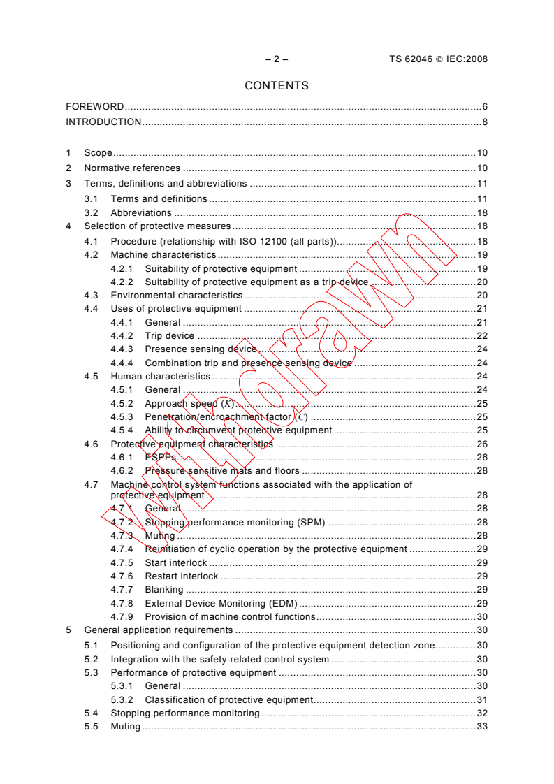 It specifies requirements for the selection, positioning, configuration and commissioning of protective equipment to detect the presence of persons in order to protect those persons from dangerous part(s) of machinery in industrial applications. This technical specification covers the application of electro-sensitive protective equipment (ESPE) specified in IEC 61496 (all parts) and pressure sensitive mats and floors specified in ISO 13856-1. It takes into account the characteristics of the machinery, the protective equipment, the environment and human interaction by persons of 14 years and older. It constitutes a general technical revision of the first edition, and includes further examples of interfacing and muting techniques.