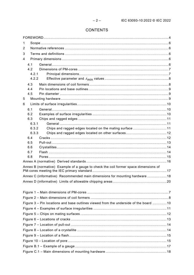 IEC 63093-10:2022 is a standard published by the International Electrotechnical Commission (IEC). Its full title is "Ferrite cores - Guidelines on dimensions and the limits of surface irregularities - Part 10: PM-cores and associated parts". This standard covers: IEC 63093-10:2022 specifies the dimensions that are of importance for mechanical interchangeability for a preferred range of PM-cores made of magnetic oxides, the main dimensions for coil formers to be used with these cores and the locations of their pins on a modular printed wiring grid in relation to the base outlines of cores. It also specifies the effective parameter values to be used in calculations and gives guidelines on allowable limits of surface irregularities applicable to the PM-cores.