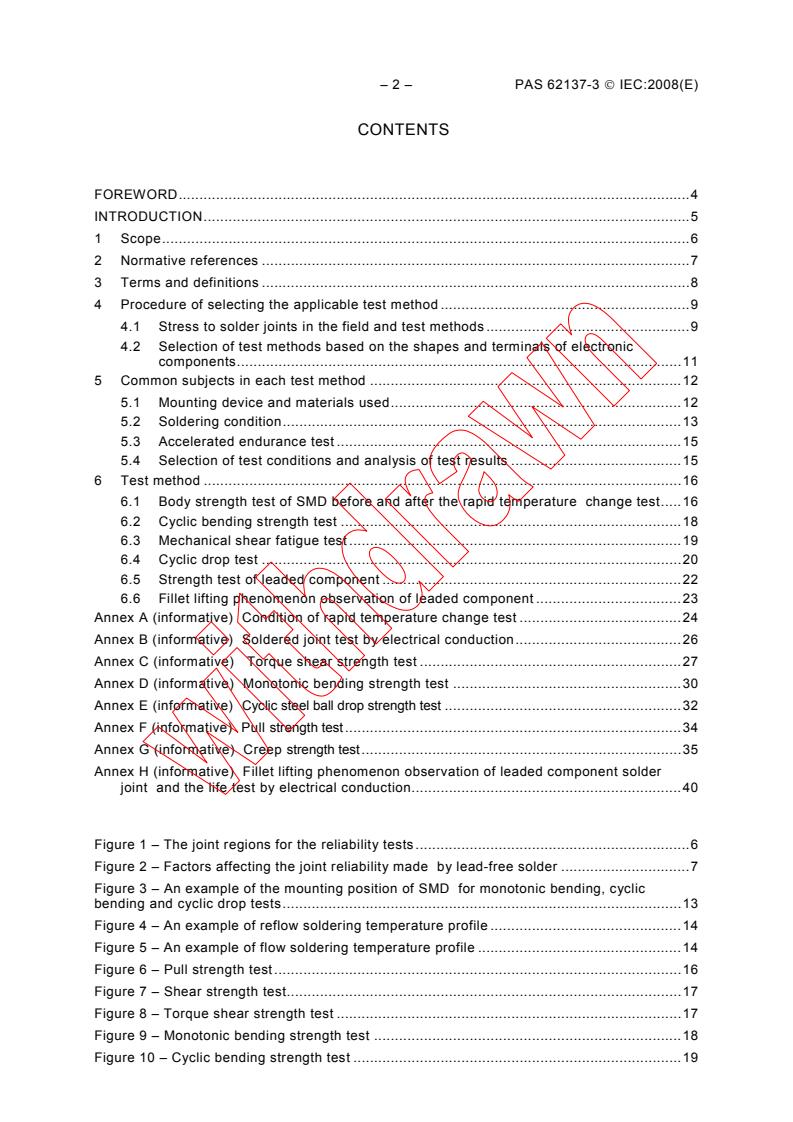 IEC/PAS 62137-3:2008(E) describes the selection of an appropriate test method for reliability test of solder joints for various shapes and types of surface mount devices (SMD) and leaded devices, including various types of solder material.