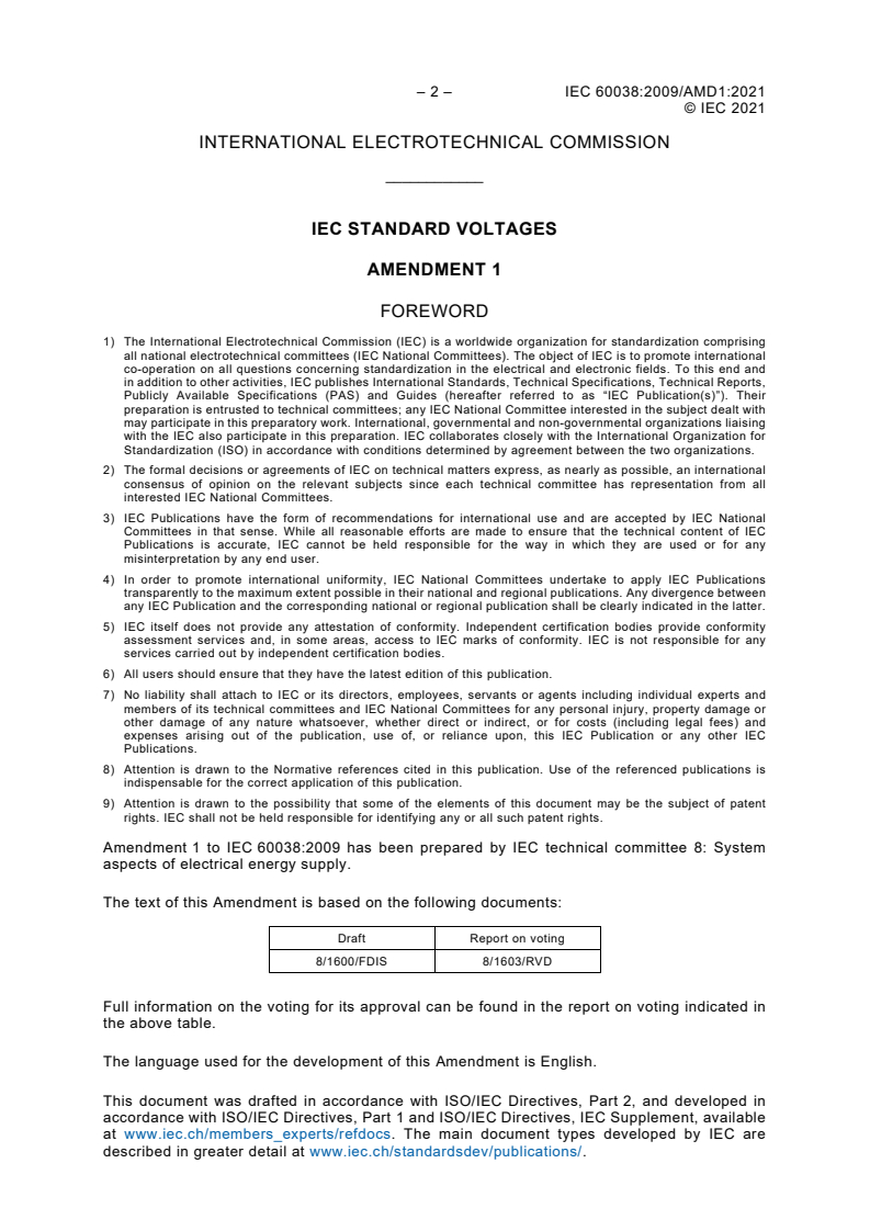 IEC 60038:2009/AMD1:2021 is a standard published by the International Electrotechnical Commission (IEC). Its full title is "Amendment 1 - IEC standard voltages". This standard covers: Amendment 1 - IEC standard voltages