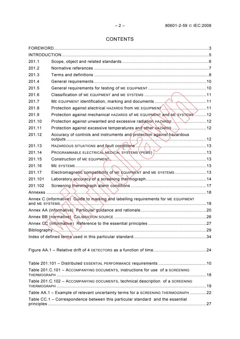 IEC 80601-2-59:2008 is a standard published by the International Electrotechnical Commission (IEC). Its full title is "Medical electrical equipment - Part 2-59: Particular requirements for the basic safety and essential performance of screening thermographs for human febrile temperature screening". This standard covers: IEC 80601-2-59:2008 applies to the basic safety and essential performance of screening thermographs intended to be used for the individual non-invasive febrile temperature screening of humans under indoor environmental conditions. IEC 80601-2-59:2008 sets laboratory characterization test limits for the screening thermograph. The contents of the corrigendum of April 2009 have been included in this copy.