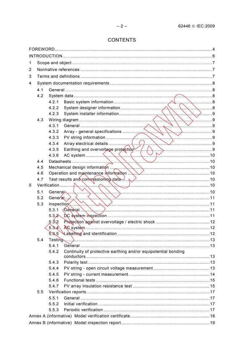 IEC 62446:2009 defines the minimal information and documentation required to be handed over to a customer following the installation of a grid connected PV system. Also describes the minimum commissioning tests, inspection criteria and documentation expected to verify the safe installation and correct operation of the system. Is written for grid connected PV systems only.