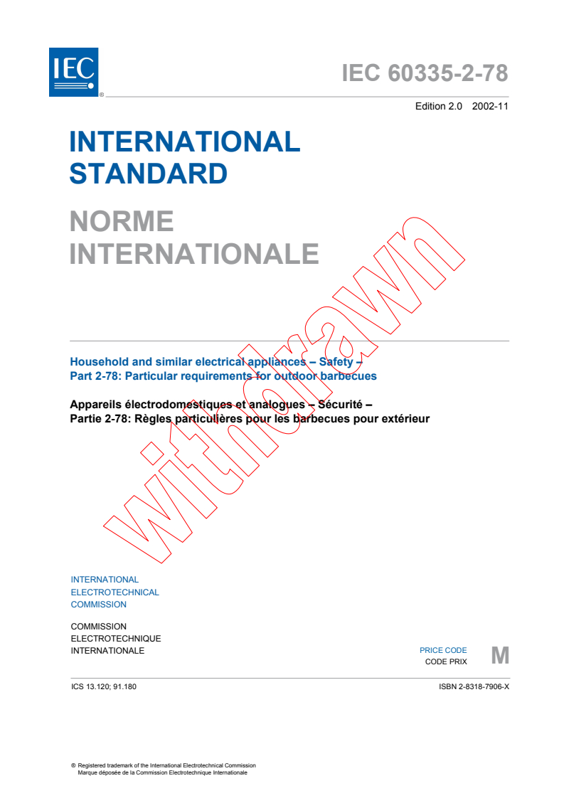 IEC 60335-2-78:2002 - Household and similar electrical appliances - Safety - Part 2-78: Particular requirements for outdoor barbecues Released:20. 11. 2002 Isbn:283187906X