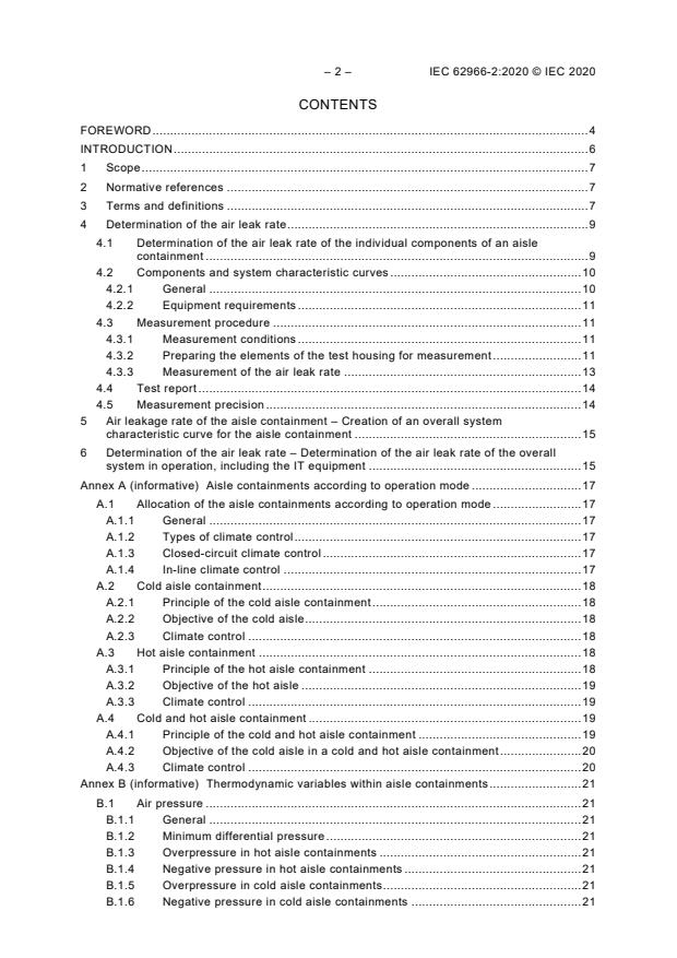 IEC 62966-2:2020 is dedicated to aisle containment techniques for information technology (IT) equipment typically used in data centres, describes the quantification of its air tightness, in particular the air loss ratio that describes the content of the volumetric flow not used for cooling the IT equipment. This ratio provides an index of efficiency, being inversely proportional to efficiency (the lower this ratio, the higher the efficiency). This document provides methods to measure an aisle containment air leakage rate and defines a classification system for aisle containment leakage.