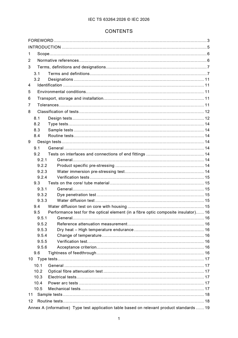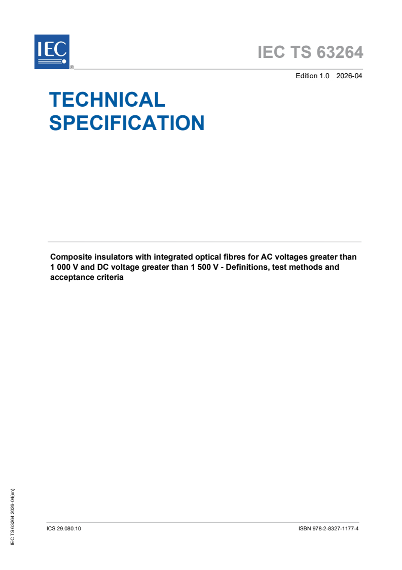 IEC TS 63264:2026 is a technical specification published by the International Electrotechnical Commission (IEC) that addresses composite insulators with integrated optical fibres for use in electrical systems operating at AC voltages above 1,000 V and DC voltages above 1,500 V. The standard defines terminology, prescribes additional test methods, and specifies acceptance criteria for the integration of fibre optic elements into composite insulators, supplementing corresponding product standards.