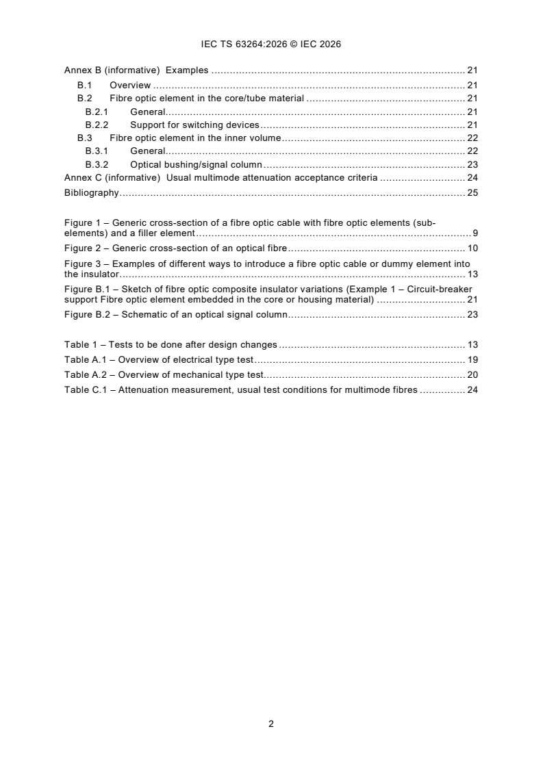 IEC TS 63264:2026 is a technical specification published by the International Electrotechnical Commission (IEC). Its full title is "Composite insulators with integrated optical fibres for AC voltages greater than 1 000 V and DC voltage greater than 1 500 V - Definitions, tests methods and acceptance criteria". This standard covers: IEC TS 63264:2026 applies to composite insulators equipped with optical fibres (fibre optic element), consisting of a load-bearing insulating core or tube, a housing (surrounding the insulating core) made of polymeric material, a fibre optic element integrated into the core or housing, or embedded in a filling media inside the inner volume of a hollow core, and end fittings permanently attached to the insulating core. The object of this document is to - define the terms used, - specify additional test methods and provide additions and modifications to tests referred, - specify acceptance criteria. This document is to be used in addition to the respective product standard applicable to the product, application and design to which the fibre optic element has been added. Furthermore, this document does not include requirements dealing with the choice of insulators for specific operating conditions or environments.