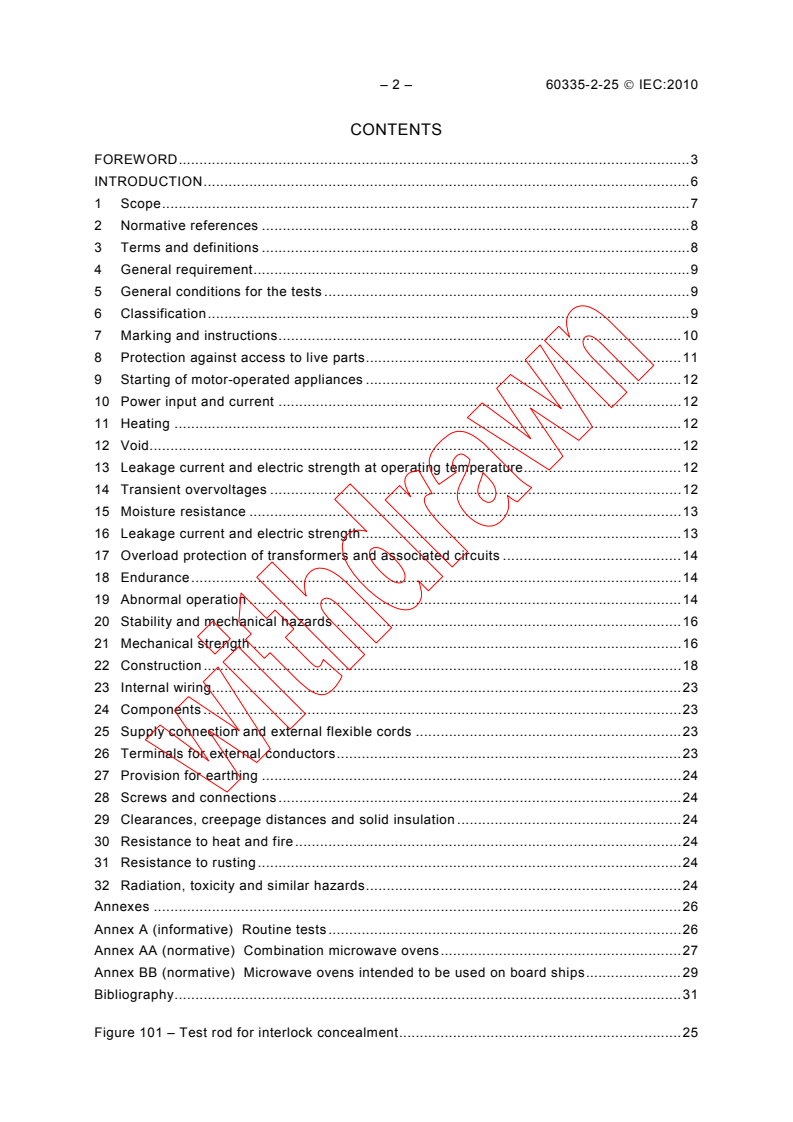 IEC 60335-2-25:2010 is a standard published by the International Electrotechnical Commission (IEC). Its full title is "Household and similar electrical appliances - Safety - Part 2-25: Particular requirements for microwave ovens, including combination microwave ovens". This standard covers: IEC 60335-2-25:2010 deals with the safety of microwave ovens for household and similar use, their rated voltage being not more than 250 V. This standard also deals with combination microwave ovens, for which Annex AA is applicable. This standard also deals with microwave ovens intended to be used on board ships, for which Annex BB is applicable. Appliances not intended for normal household use but which nevertheless may be a source of danger to the public, such as appliances intended to be used by laymen in shops, in light industry and on farms, are within the scope of this standard. However, if the appliance is intended to be used professionally to process food for commercial purposes, the appliance is not considered to be for household and similar use only. The principal changes with respect to the previous edition are as follows: - the scope is modified to, cover microwave ovens on board ships, to better define seperation between "household and similar use" and "commercial use" and indicate it does not to take into account persons whose capabilities or lack of experience and knowledge prevents them from using the appliance safely without supervision or instruction and children playing with the appliance; - the intended use is defined for clarification; - the door endurance test is rationalised; - the replacement of 22.103, 22.104 and 22.105 allows interlock systems with at least one concealed door interlock as well as alternative interlock systems without concealed door interlock; - the tests on electronic door interlock systems are defined for clarification; - the pollution degree of combination microwave ovens is defined for clarification; - the thickness requirement for sheaths of visibly glowing heating elements of combination microwave ovens is defined for clarification. It is the recommendation that the content of this publication be adopted for implementation nationally not earlier than 12 months or later than 36 months from the date of publication.