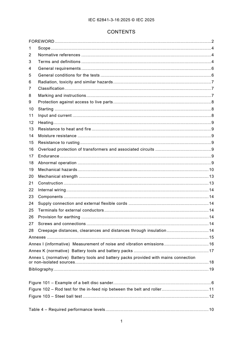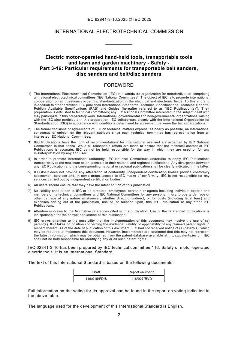 IEC 62841-3-16:2025 is a standard published by the International Electrotechnical Commission (IEC). Its full title is "Electric motor-operated hand-held tools, transportable tools and lawn and garden machinery - Safety - Part 3-16: Particular requirements for transportable belt sanders, disc sanders and belt/disc sanders". This standard covers: IEC 62841-3-16:2025 applies to transportable belt sanders, disc sanders and belt/disc sanders which are equipped with – a sanding belt; or – a sanding disc; or – a sanding belt and a sanding disc for sanding solid materials. This document does not apply to hand-held disc-type sanders. NOTE 101 Hand-held disc-type sanders are covered by IEC 62841-2-3. This document does not apply to hand-held belt sanders. NOTE 102 Hand-held belt sanders are covered by IEC 62841-2-4. This Part 3-16 is to be used in conjunction with the first edition of IEC 62841-1:2014 and IEC 62841-1:2014/AMD1:2025. This Part 3-16 supplements or modifies the corresponding clauses in IEC 62841-1:2014, so as to convert it into the IEC Standard: Particular requirements for transportable belt sanders, disc sanders and belt/disc sanders. Where a particular subclause of IEC 62841-1:2014 is not mentioned in this Part 3-16, that subclause applies as far as relevant. Where this document states "addition", "modification" or "replacement", the relevant text in IEC 62841-1:2014 is to be adapted accordingly. NOTE The attention of National Committees is drawn to the fact that equipment manufacturers and testing organizations can need a transitional period following publication of a new, amended or revised IEC publication in which to make products in accordance with the new requirements and to equip themselves for conducting new or revised tests. It is the recommendation of the committee that the content of this publication be adopted for implementation nationally not earlier than 36 months from the date of publication.