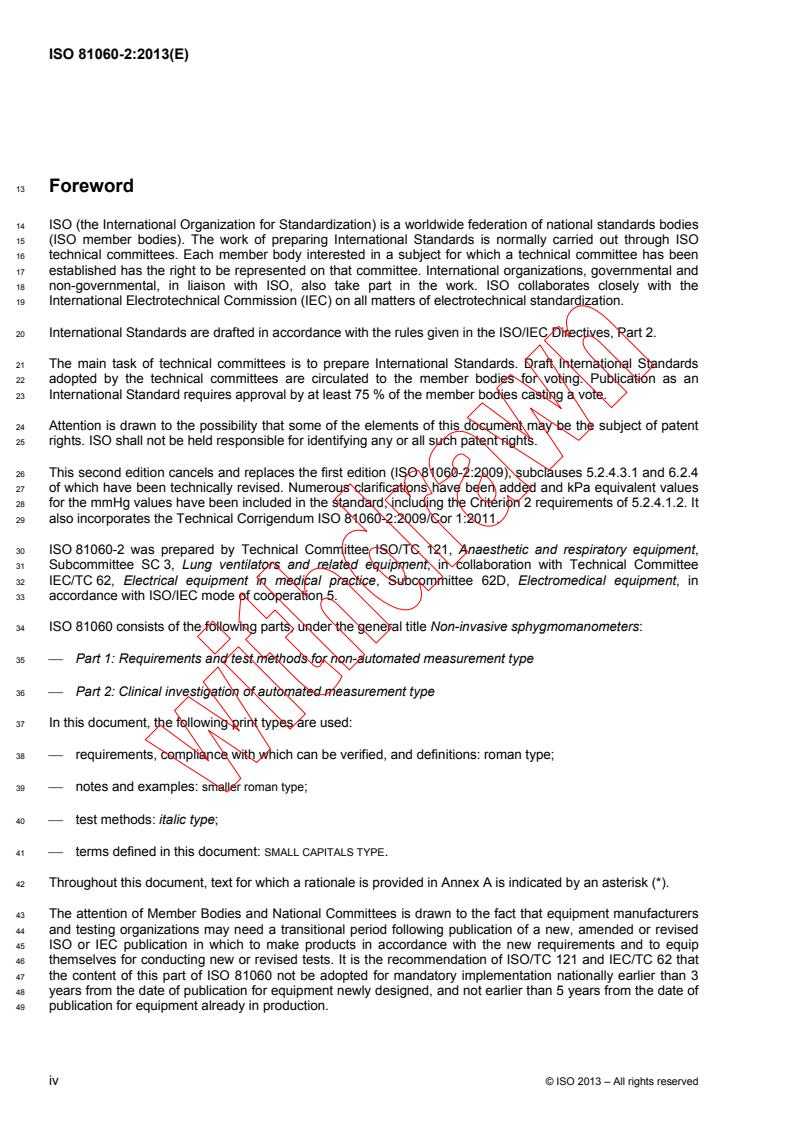 ISO 81060-2:2013 specifies the requirements and methods for the clinical investigation of me equipment used for the intermittent non-invasive automated estimation of the arterial blood pressure by utilizing a cuff. ISO 81060-2:2013 is applicable to all sphygmomanometers that sense or display pulsations, flow or sounds for the estimation, display or recording of blood pressure. These sphygmomanometers need not have automatic cuff inflation. ISO 81060-2:2013 covers sphygmomanometers intended for use in all patient populations and all conditions of use. ISO 81060-2:2013 specifies additional disclosure requirements for the accompanying documents of sphygmomanometers that have undergone clinical investigation according to ISO 81060-2:2013.