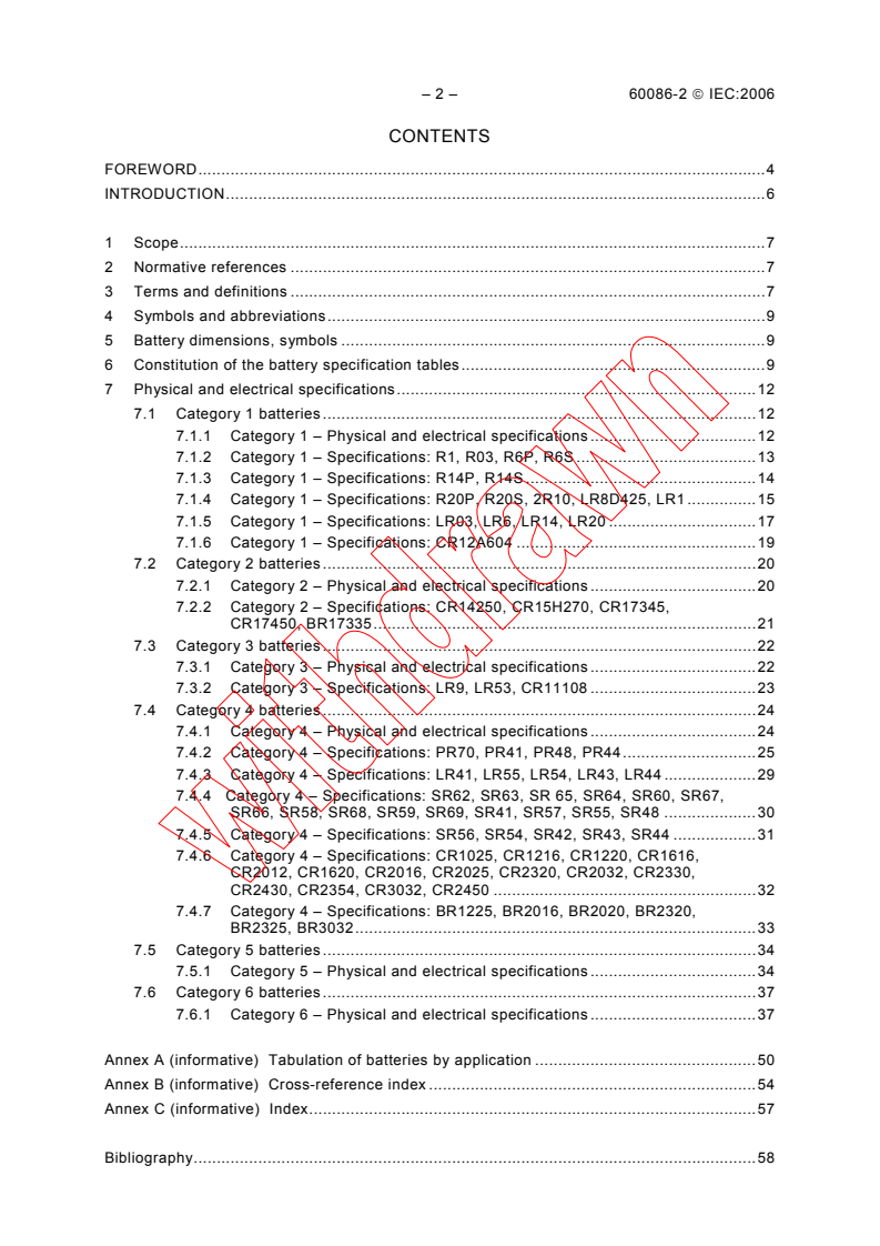 - Categorised tables: Physical and electrical specifications organized by battery category (Category 1 through 6), plus annexes tabulating batteries by application and cross‑reference indexes.