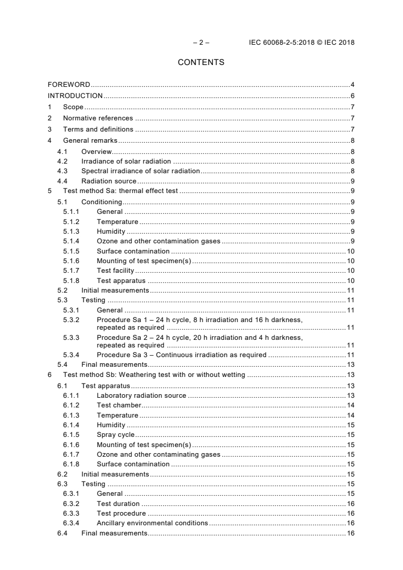 IEC 60068-2-5:2018 is a standard published by the International Electrotechnical Commission (IEC). Its full title is "Environmental testing - Part 2-5: Tests - Test S: Simulated solar radiation at ground level and guidance for solar radiation testing and weathering". This standard covers: IEC 60068-2-5:2018 specifies the methods for testing equipment or components under simulated solar radiation conditions. This document is applicable to the equipment and components at the surface of the earth. This third edition cancels and replaces the second edition of published in 2010. This edition constitutes a technical revision. This edition includes the following significant technical changes with respect to the previous edition: - the title of this document has been modified; - the current thermal effect test method, specified as "Test method Sa" has been retained and the weathering test method specified as "Test method Sb" has been added.