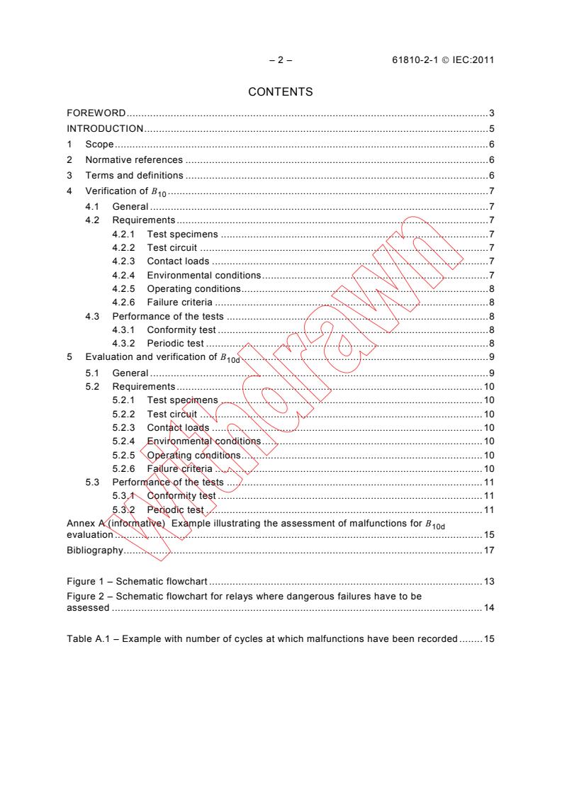 IEC 61810-2-1:2011 is a standard published by the International Electrotechnical Commission (IEC). Its full title is "Electromechanical elementary relays - Part 2-1: Reliability - Procedure for the verification of B<sub>10</sub> values". This standard covers: IEC 61810-2-1:2011 specifies reliability test procedures for electromechanical elementary relays when enhanced requirements for the verification of reliability apply. Particular provisions are given for relays incorporated in safety-related control systems of machinery in accordance with IEC 62061 and ISO 13849-1. For such relays B10 values for dangerous failures (B10d values) are derived from the tests specified in this standard. This publication is to be read in conjunction with IEC 61810-2:2011.