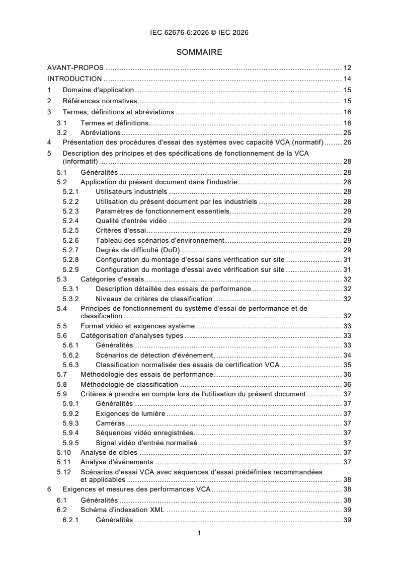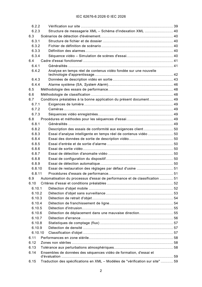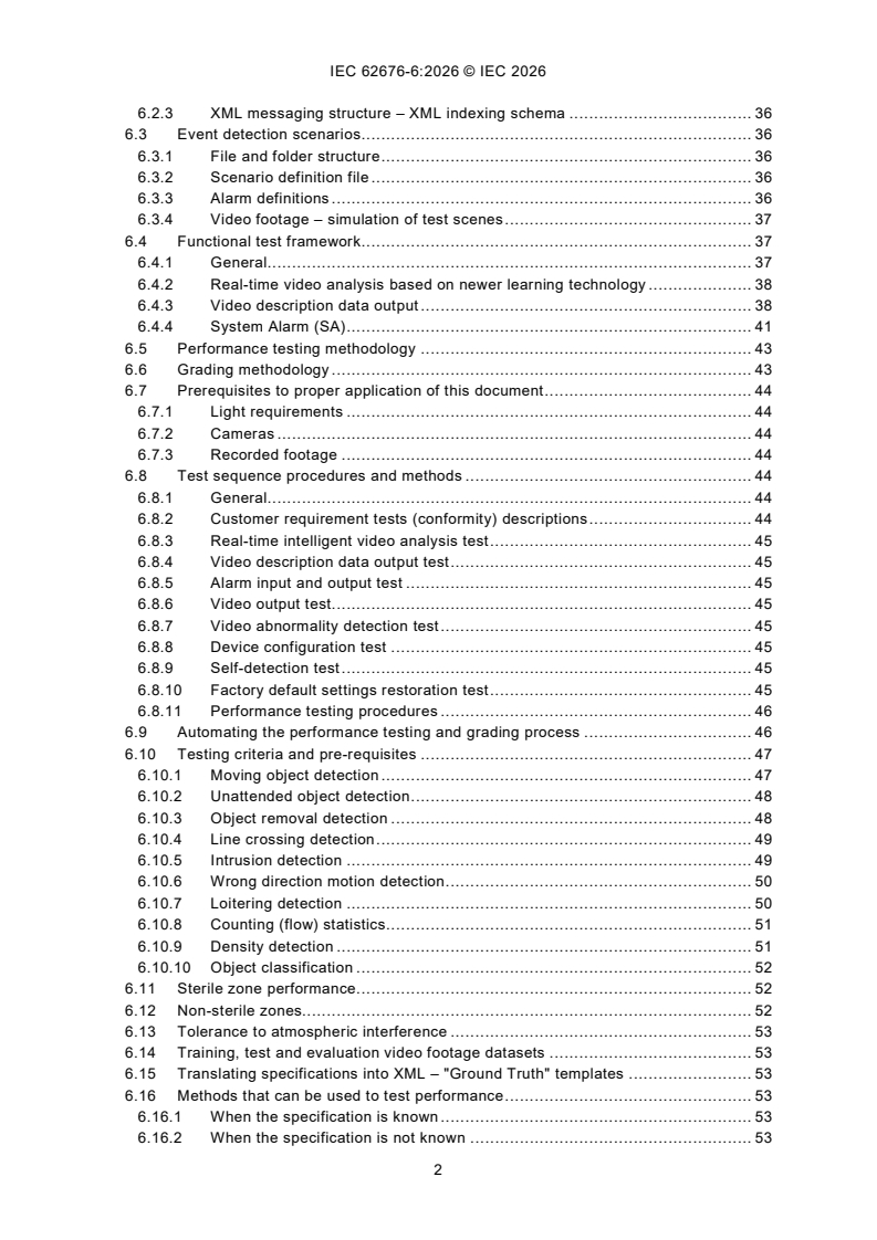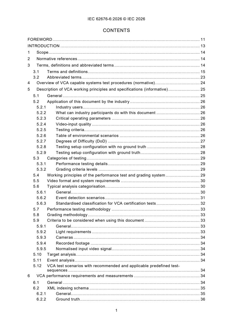 IEC 62676-6:2026 is a standard published by the International Electrotechnical Commission (IEC). Its full title is "Video surveillance systems for use in security applications - Part 6: Performance testing and grading of real-time intelligent video content analysis devices and systems for use in video surveillance applications". This standard covers: IEC 62676-6:2026 specifies the functions, performance, interfaces, environmental adaptability, test methods, performance evaluation and grading rules of real-time intelligent video analysis in surveillance systems. This document applies to live and forensic, real-time intelligent video analysis devices and systems in video surveillance. The document is centred on testing performance and grading device functionality which enables: • Core capability: Classification of objects, detection of specific "object activity", such as "stopping", "starting", "direction of movement", etc. Examples are listed in Annex A. • Complex capability: Detection of "scenarios" which are based on combinations of object activity, such as "loitering", "perimeter intrusion detection", "person down", "tailgating", "intrusion", "abandoned object detection", explosion, fire, flood, potential terrorist attack using a vehicle, owner of an abandoned bag, etc. Examples of current scenarios are listed and described in Annex B. • Degree of difficulty: The application of real operating environments to test the performance under known or required operating stress levels, examples of operating stress levels that are sterile or non-sterile, indoor or outdoor, target obscuration levels, extreme weather conditions, vibrating mechanical rugged environments causing image shake resulting in degradation of image quality requirement, see Table 1 and Annex C. The purpose of this document is to provide end users, at different levels of the service process, from users and installers, integrators and maintenance companies, to certification providers, with methods to measure the performance of video analysis systems that must also comply with other parts of the standard.
