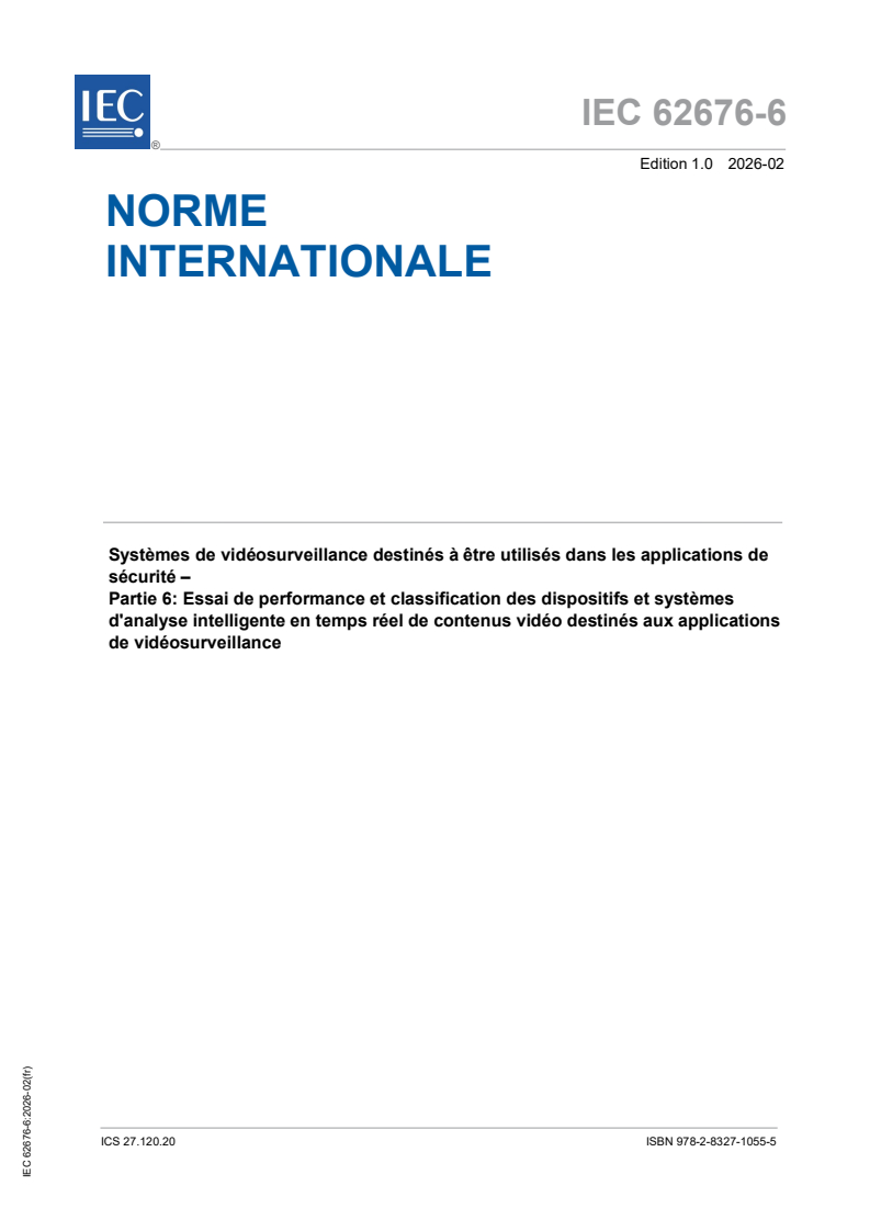 IEC 62676-6:2026 specifies the functions, performance, interfaces, environmental adaptability, test methods, performance evaluation and grading rules of real-time intelligent video analysis in surveillance systems.