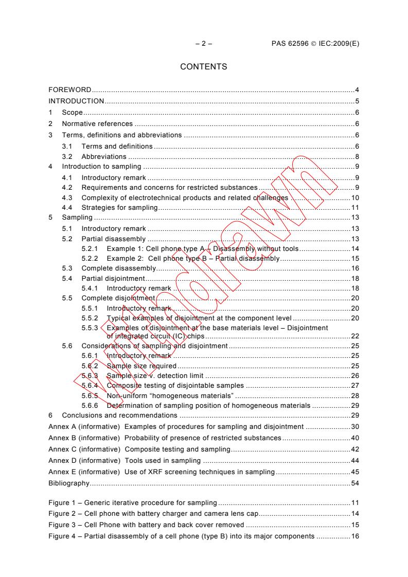 IEC/PAS 62596:2009(E) is a Publicly Available Specification which provides general sampling guidelines and strategies of sampling for electrotechnical products, electronic assemblies, electronic components. In order to obtain samples that can be used for analytical testing to determine the levels of restricted substances as described in the test methods of IEC 62321. Restrictions for substances will vary between geographic regions and from time to time. This document describes a generic process for the sampling of any substance which could be restricted.