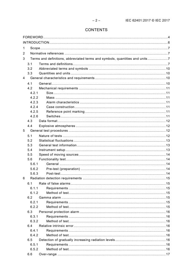 IEC 62401:2017 is a standard published by the International Electrotechnical Commission (IEC). Its full title is "Radiation protection instrumentation - Alarming personal radiation devices (PRDs) for the detection of illicit trafficking of radioactive material". This standard covers: IEC 62401:2017 describes design and functional criteria along with testing methods for evaluating the performance of Personal Radiation Devices (PRDs) used for detection of illicit trafficking of radioactive material (e. g., for border radiation monitoring). This document applies to alarming radiation detection instruments that are pocket-sized, carried on the body and used to detect and indicate the presence and general magnitude of gamma radiation fields. Neutron detection may also be provided. This new edition includes the following significant technical changes with respect to the previous edition: a) making the standard consistent with the new standards for detection of illicit trafficking of radioactive material (see the Introduction); b) changing some basic requirements; c) creating a uniform functionality test for all environmental, electromagnetic and mechanical tests; d) reference to IEC 62706 for the environmental, electromagnetic and mechanical test conditions.