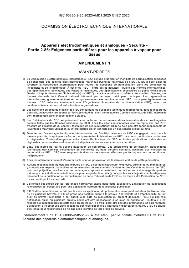 IEC 60335-2-85:2022/AMD1:2025 - Amendement 1 - Appareils électrodomestiques et analogues - Sécurité - Partie 2-85: Exigences particulières pour les appareils à vapeur pour tissus Released:30. 10. 2025 Isbn:9782832708040