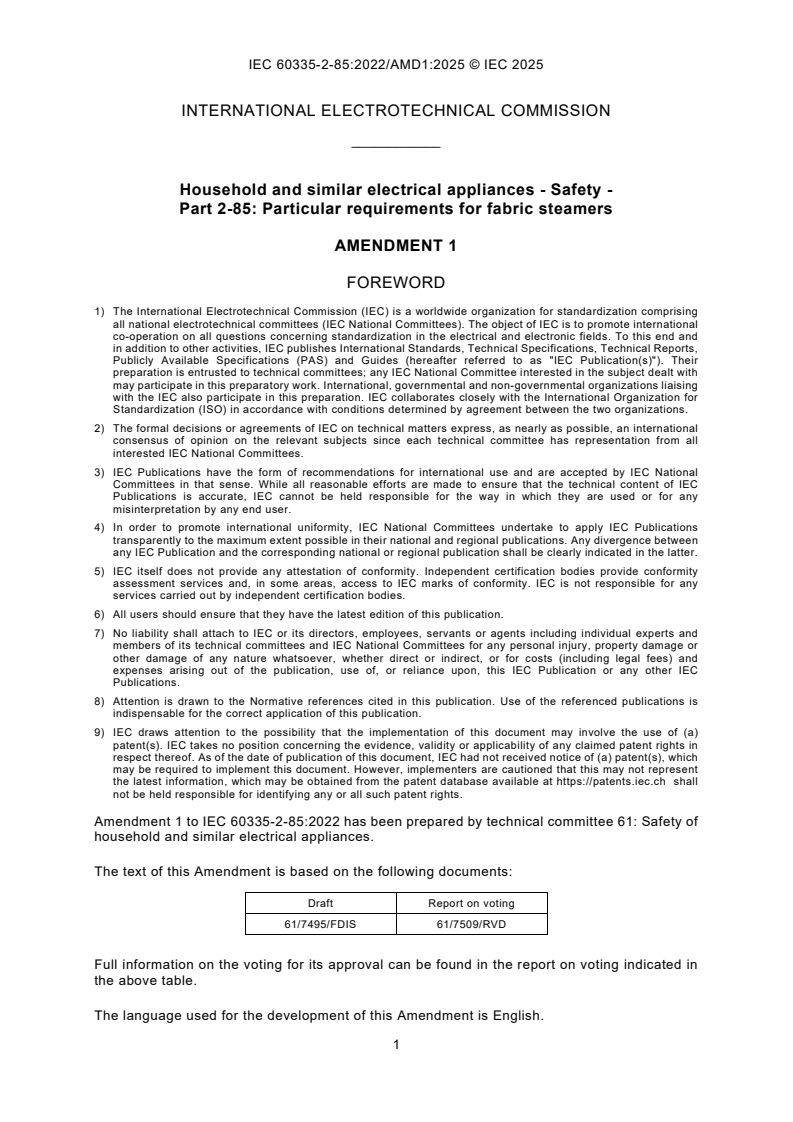 IEC 60335-2-85:2022/AMD1:2025 - Amendment 1 - Household and similar electrical appliances - Safety - Part 2-85: Particular requirements for fabric steamers Released:30. 10. 2025 Isbn:9782832708040