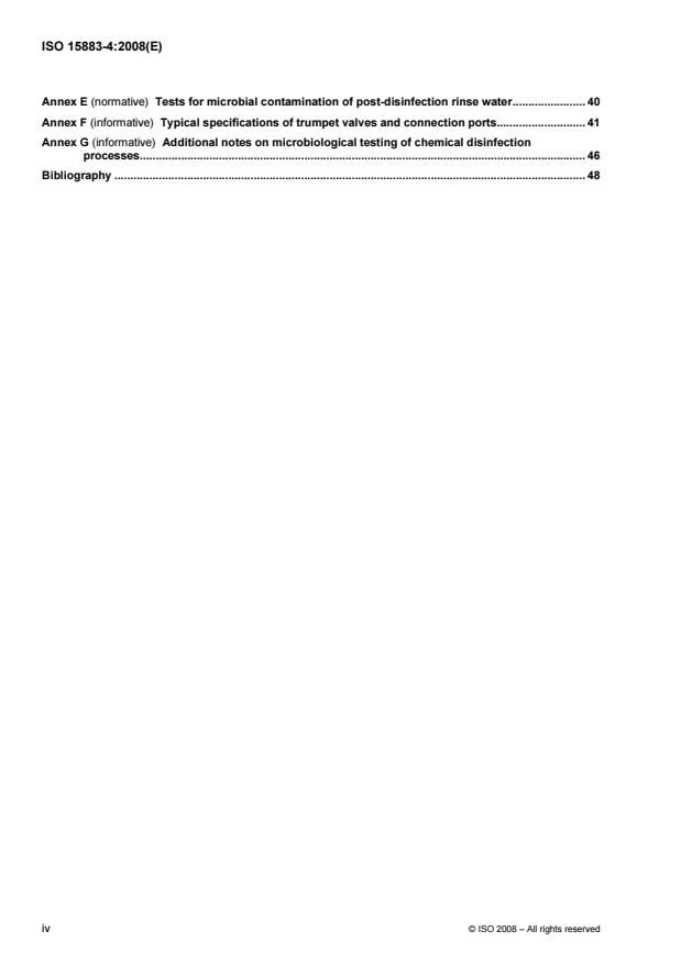 ISO 15883-4:2008 specifies the particular requirements, including performance, for washer-disinfectors (WDs) that are intended to be used for cleaning and chemical disinfection of thermolabile endoscopes. ISO 15883-4:2008 also specifies the performance requirements for the cleaning and disinfection of the washer-disinfector and its components and accessories which may be required to achieve the necessary performance. The methods, instrumentation and instructions required for type testing, works testing, validation (installation, operational and performance qualification on first installation), routine control and monitoring and re-validation, periodically and after essential repairs, are also specified. ISO 15883-4:2008 can be used by prospective purchasers and manufacturers as the basis of agreement on the specification of WD manufacturers of endoscopes, cleaning products, disinfecting products, and also by users.