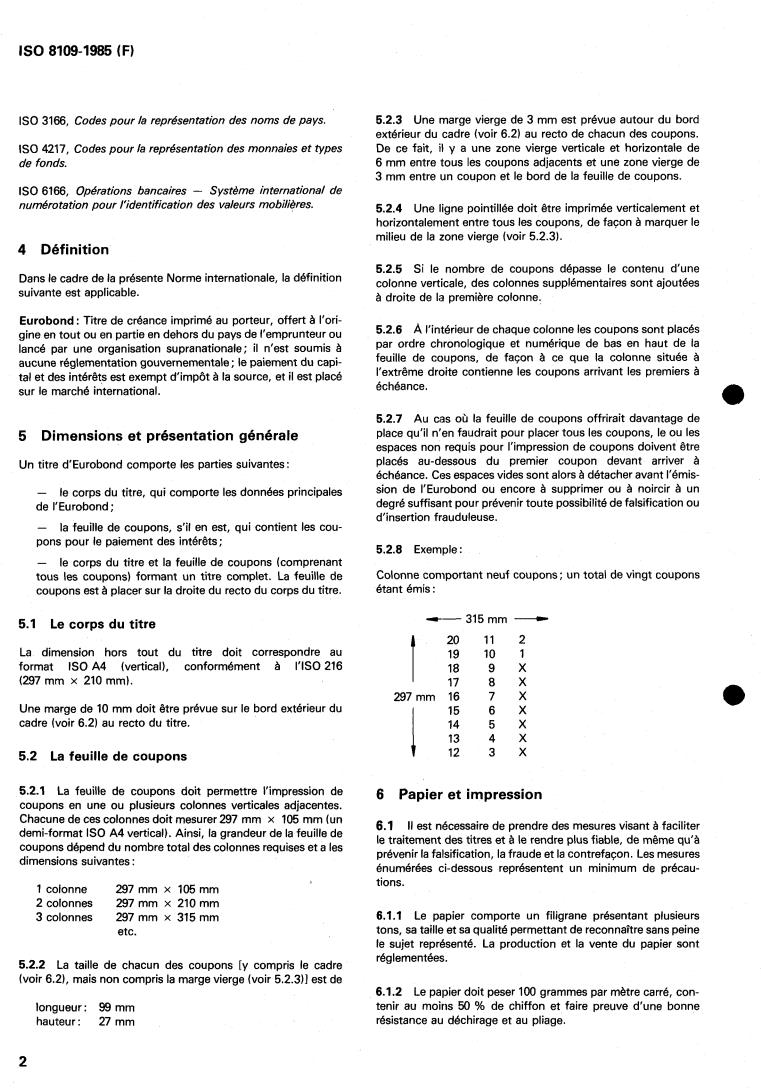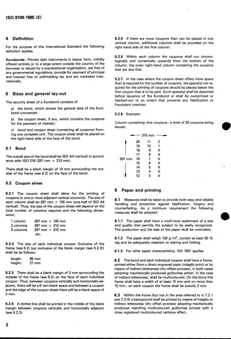 ISO 8109:1985 is a standard published by the International Organization for Standardization (ISO). Its full title is "Securities — Format of Eurobonds". This standard covers: Securities — Format of Eurobonds