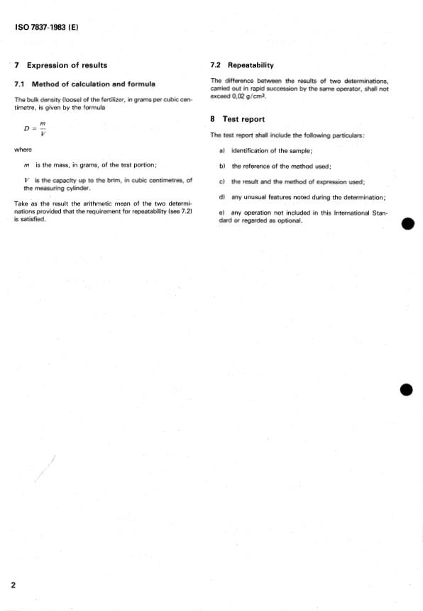 ISO 7837:1983 is a standard published by the International Organization for Standardization (ISO). Its full title is "Fertilizers — Determination of bulk density (loose) of fine-grained fertilizers". This standard covers: Fertilizers — Determination of bulk density (loose) of fine-grained fertilizers