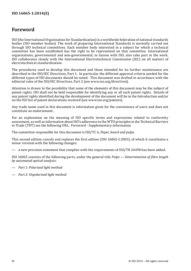 ISO 16065-1:2014 is a standard published by the International Organization for Standardization (ISO). Its full title is "Pulps - Determination of fibre length by automated optical analysis - Part 1: Polarized light method". This standard covers: ISO 16065-1:2014 specifies a method for determining fibre length using polarized light. ISO 16065-1:2014 is applicable to all kinds of pulp. However, fibrous particles shorter than 0,2 mm are not regarded as fibres for the purposes of ISO 16065-1:2014 and, therefore, are not to be included in the results.