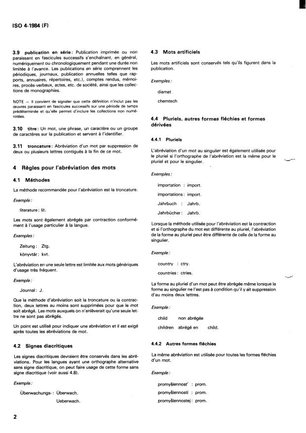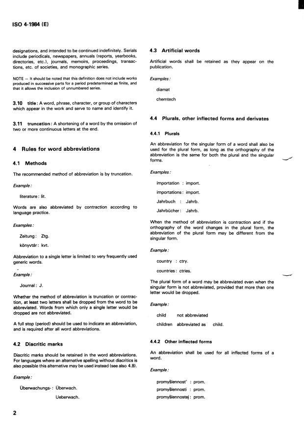IS0 4-1984 (E) designations, and intended to be continued indefinitely. Serials include periodicals, newspapers, annuals (reports, yearbooks, directories, etc. 1, journals, memoirs, proceedings, transac- tions, etc. of societies, and monographic series. NOTE - It should be noted that this definition does not include works produced in successive parts for a period predetermined as finite, and that it allows the inclusion of unnumbered series. 4.3 Artificial words Artificial words shall be retained as they appear on the publication. Examples : diamat chemtech 3.10 which appear in the work and serve to name and identify it. title: A word, phrase, character, or group of characters 4.4 Plurals, other inflected forms and derivates 3.11 two or more continuous letters at the end. truncation : A shortening of a word by the omission of 4.4.1 Plurals 4 Rules for word abbreviations 4.1 Methods The recommended method of abbreviation is by truncation. Example : literature : lit. Words are also abbreviated by contraction according to language practice. Examples : Zeitung : Ztg. konyvthr : kvt. Abbreviation to a single letter is limited to very frequently used generic words. Example : Journal: J. Whether the method of abbreviation is truncation or contrac- tion, at least two letters shall be dropped from the word to be abbreviated. Words from which only a single letter would be dropped are not abbreviated. A full stop (period) should be used to indicate an abbreviation, and is required after all word abbreviations. 4.2 Diacritic marks Diacritic marks should be retained in the word abbreviations. For languages where an alternative spelling without diacritics is also possible this alternative may be used instead (see also 4.8). Example : Überwachungs- : Überwach. Ueberwach. An abbreviation for the singular form of a word shall also be used