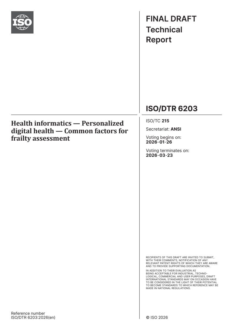 ISO/DTR 6203 - Health informatics — Personalized digital health — Common factors for frailty assessment Released:12. 01. 2026
