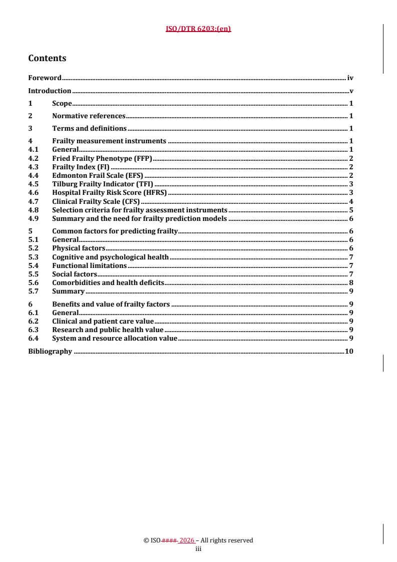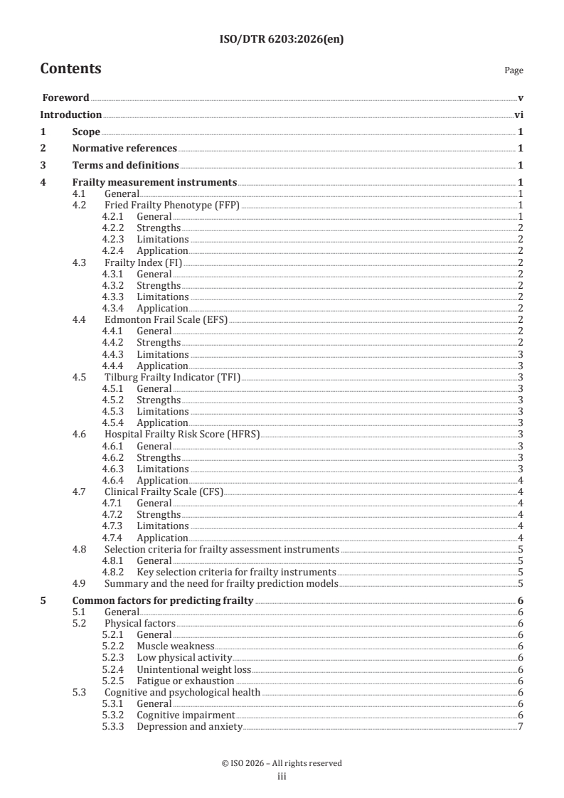 Keywords: ISO/DTR 6203, frailty assessment, health informatics, personalized digital health, frailty measurement tools, Fried Frailty Phenotype, Frailty Index, Edmonton Frail Scale, Tilburg Frailty Indicator, frailty prediction models, aging population, healthcare resource allocation, clinical decision support, public health surveillance, digital health standards.