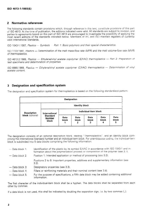 ISO 461301:1993(E) 2 Normative references The following Standards contain provisions which, through reference in this text, constitute provisions of this part of ISO 4613. At the time of publication, the editions indicated were valid. All Standards are subject to revision, and Parties to agreements based on this part of ISO 4613 are encouraged to investigate the possibility of applying the most recent editions of the Standards indicated below. Members of IEC and ISO maintain registers of currently valid International Standards. ISO 1043-1 :1987, Plastics - Symbols - Part 1: Basic polymers and their special characteristics. ISO 1133:1991, Plastics - Determination of the melt mass-flow rate (MFß) and the melt volume-flow rate (MVß) of thermoplastics. ISO 4613-2:1989, Plastics - Ethylene/vinyl acetate copolymer (E/vAC) thermoplastics - Part 2: Preparation of tes t specimens and de termina tion of properties. ISO 8985: 1989, Plastics - Ethylene/vinyl acetate copolymer (ENAC) thermoplastics - Determination of Vinyl acetate content. 3 Qesignation and specification system The designation and specification System for thermoplastics is based on the following standardized Pattern: Designation Internationall lndividuakm block The designation consists of an optional description block, reading “Thermoplastics”, and an identity block com- prising the International Standard number and an individual-item block. For unambiguous coding, the individual-item block is subdivided into 5 data blocks comprising the following information: - Data block 1: - Data block 2: Identification of the plastic by its Symbol E/VAC in accordance with ISO 1043-1 and in- formation about the polymerization process or composition of the polymer (see 3.1). Position 1: Intended application or method of processing (see 3.2). - Data block 3: - Data block 4: - Data block 5: Positions 2 to 8: Important properties, additives and supplementary information (see 3 2) . . Designatory properties (see 3.3). Fillers or reinforcing materials and their nominal content (see 3.4). For the purpose of specifications, a fifth data block m