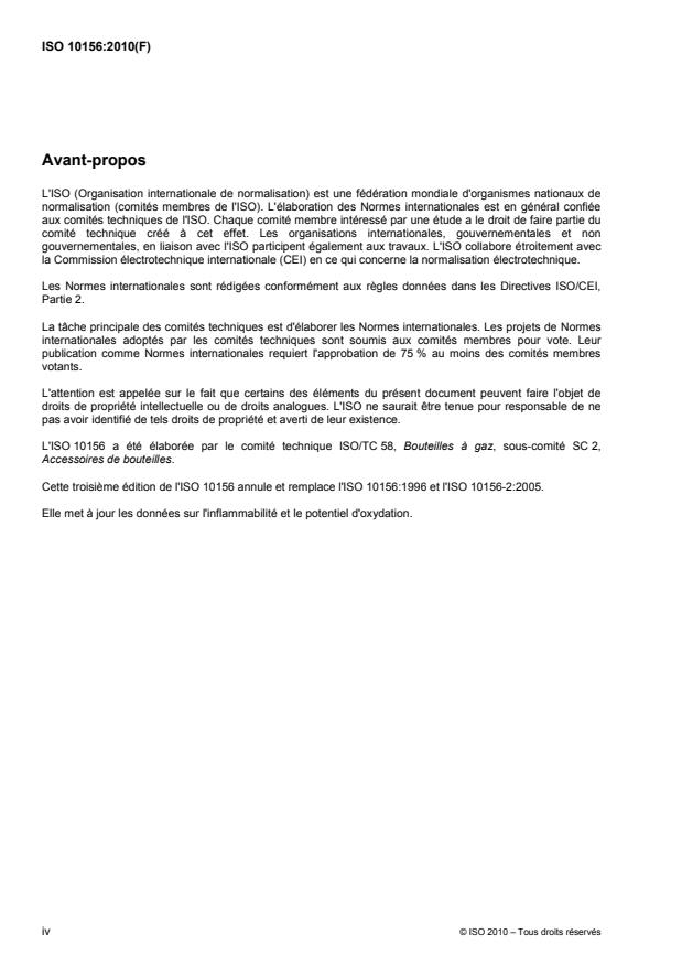 L'ISO 10156:2010 spécifie des méthodes servant à déterminer si un gaz ou un mélange de gaz est ou non inflammable à l'air et si un gaz ou un mélange de gaz est plus ou moins oxydant que l'air, dans les conditions atmosphériques. Elle est destinée à être utilisée pour la classification des gaz et des mélanges de gaz, y compris pour le choix des raccords de sortie de robinets de bouteilles à gaz. Elle ne traite pas de la préparation en toute sécurité de ces mélanges à une pression et à des températures autres que les conditions ambiantes.