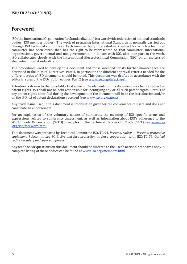 ISO/TR 22463:2019 is a technical report published by the International Organization for Standardization (ISO). Its full title is "Patient and client eye protectors for use during laser or intense light source (ILS) procedures - Guidance". This standard covers: This document gives guidelines for and provides information to employers, users and safety advisors on the selection and use of patient eye protectors (PEPs) for lasers and intense light source (ILS) equipment used for medical and cosmetic applications. This document does not apply to the eye protection of laser/ILS operators or users of the equipment. It also does not apply to PEPs for use with tanning equipment or ophthalmic instruments, either for the user/operator or the patient/client.