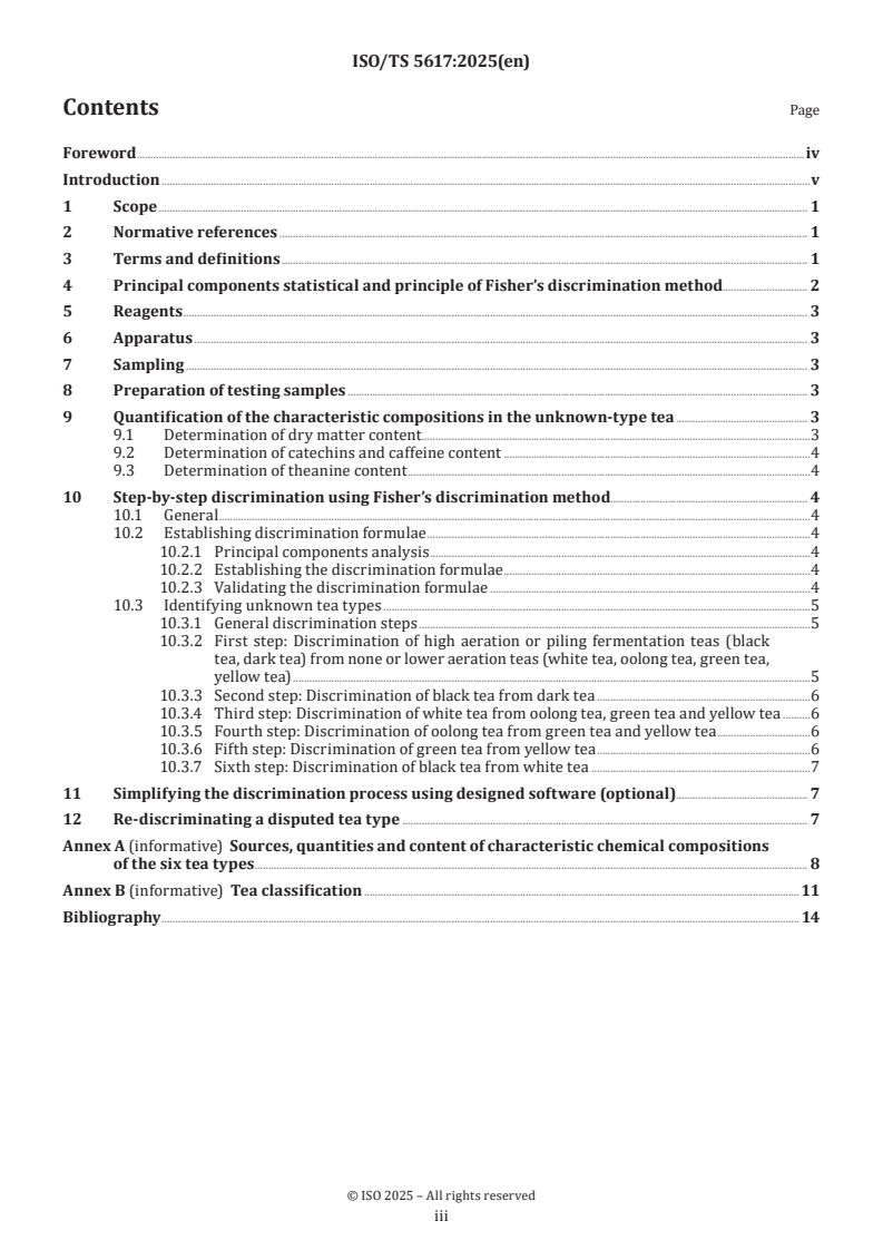 ISO/TS 5617:2025 is a technical specification published by the International Organization for Standardization (ISO). Its full title is "Tea - Classification by chemical composition". This standard covers: This document specifies a method to classify six tea types (black tea, green tea, white tea, oolong (blue) tea, dark tea and yellow tea) based on statistical analysis of chemical compositions. The key X1 to X6 determinants (total catechins, caffeine, theanine, epigallocatechin gallate (EGCG)/total catechins, theanine × theanine, theanine × caffeine) for tea chemical classification were extracted from these critical compositions by statistical methods, from a large-scale chemical analysis of samples of six tea types, which can be used as principal components to classify the particular tea by Fisher’s step-by-step discrimination formulae.[6][7] This document is applicable to the classification of both primary and refined teas, and is particularly suitable for teas produced in China. It does not apply to reprocessed teas.