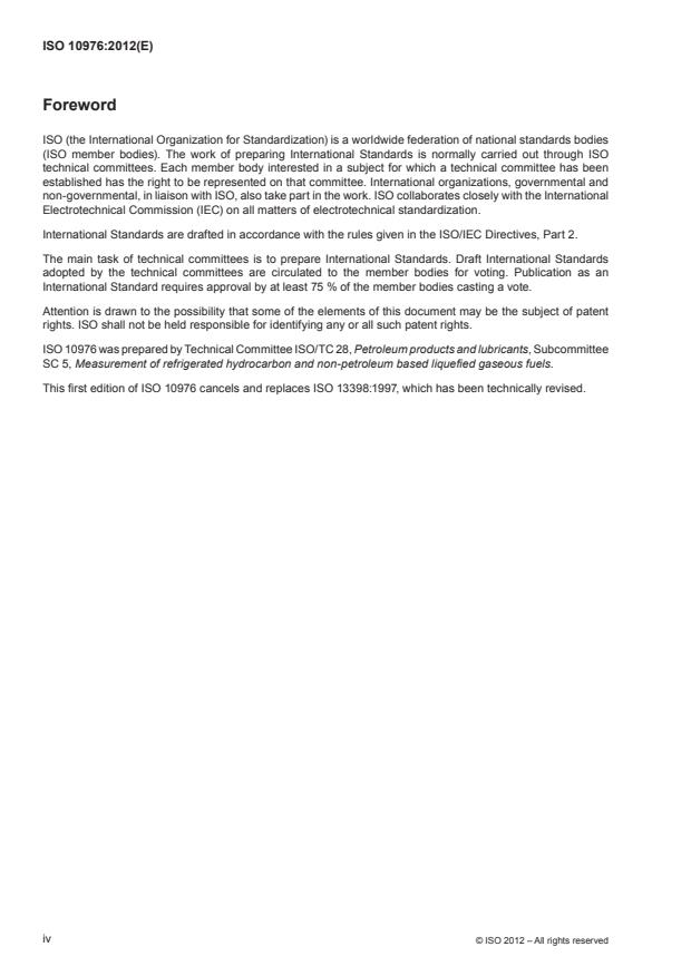 ISO 10976:2012 is a standard published by the International Organization for Standardization (ISO). Its full title is "Refrigerated light hydrocarbon fluids - Measurement of cargoes on board LNG carriers". This standard covers: Refrigerated light hydrocarbon fluids - Measurement of cargoes on board LNG carriers