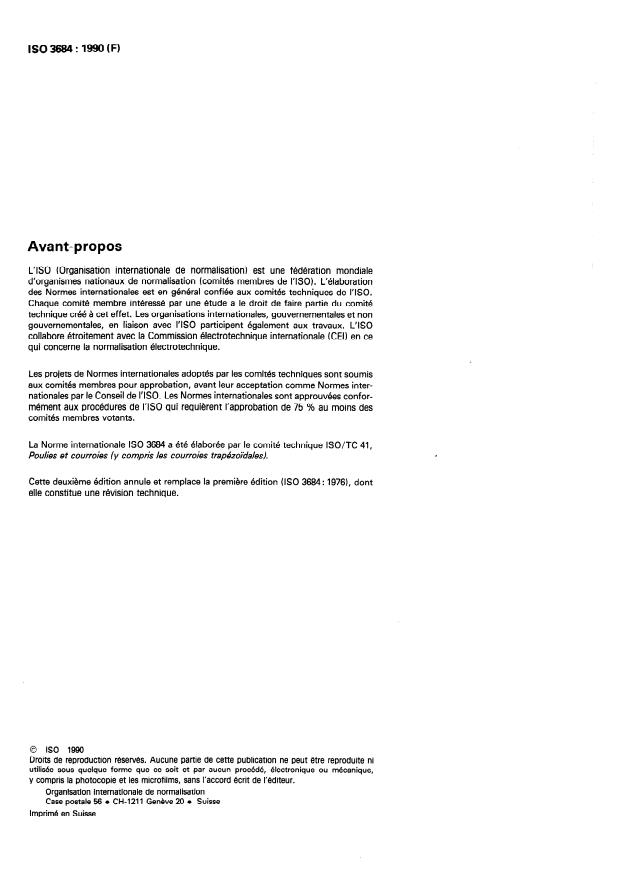 ISO 3684:1990 is a standard published by the International Organization for Standardization (ISO). Its full title is "Conveyor belts — Determination of minimum pulley diameters". This standard covers: This second edition cancels and replaces the first edition (1976). Establishes a method of calculating minimum pulley diameters. Applies to belts made of rubber or plastics with textile or metal carcasses. Is not applicable to belts which have a carcass thickness of more than 20 mm or to those which have intermediate lyers of rubber or plastics of more than 0,8 mm thickness between the plies, and not applies to heat-resistant belts for hot products over 100 °C or to belts in service at temperatures under -40 °C.