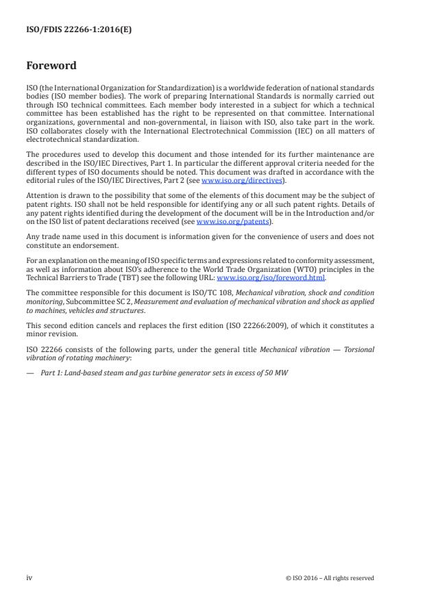 ISO/FDIS 22266-1 is a draft published by the International Organization for Standardization (ISO). Its full title is "Mechanical vibration — Torsional vibration of rotating machinery — Part 1: Land-based steam and gas turbine generator sets in excess of 50 MW". This standard covers: Mechanical vibration — Torsional vibration of rotating machinery — Part 1: Land-based steam and gas turbine generator sets in excess of 50 MW