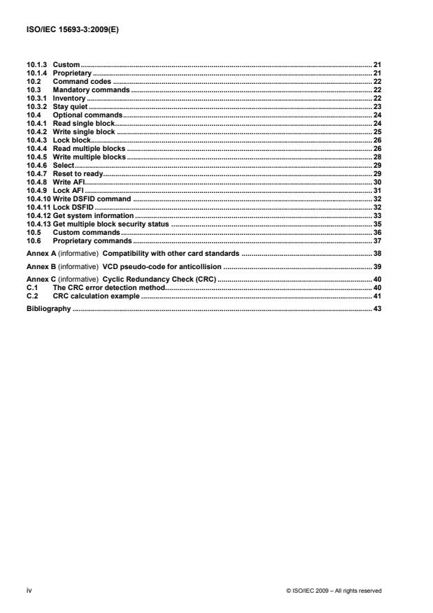 ISO/IEC 15693-3:2009 specifies: protocol and commands, other parameters required to initialize communications between a vicinity integrated circuit card and a vicinity coupling device, methods to detect and communicate with one card among several cards ("anticollision"), optional means to ease and speed up the selection of one among several cards based on application criteria.