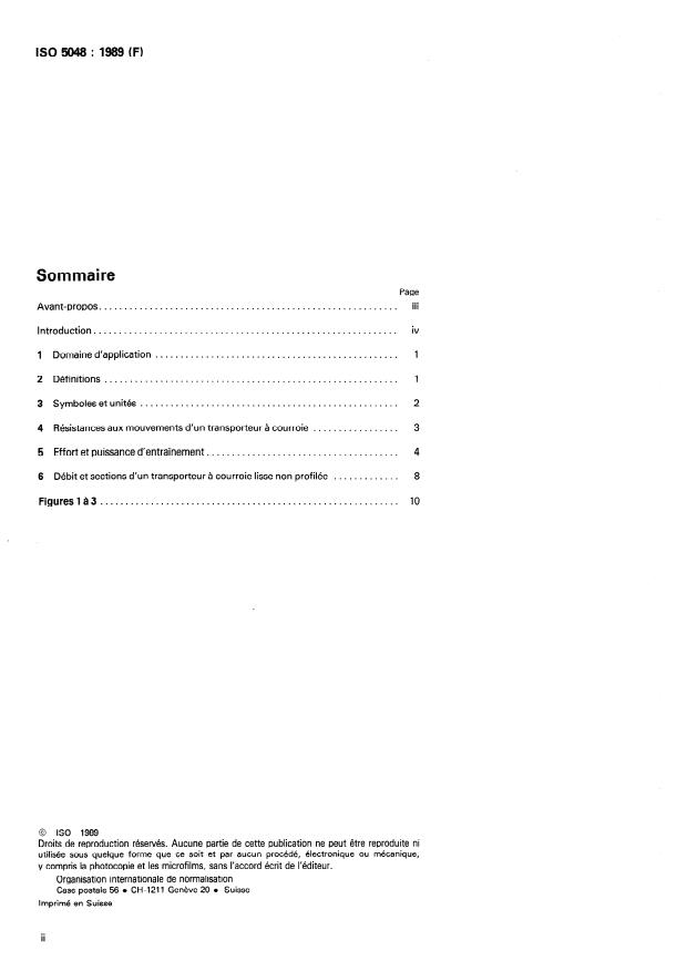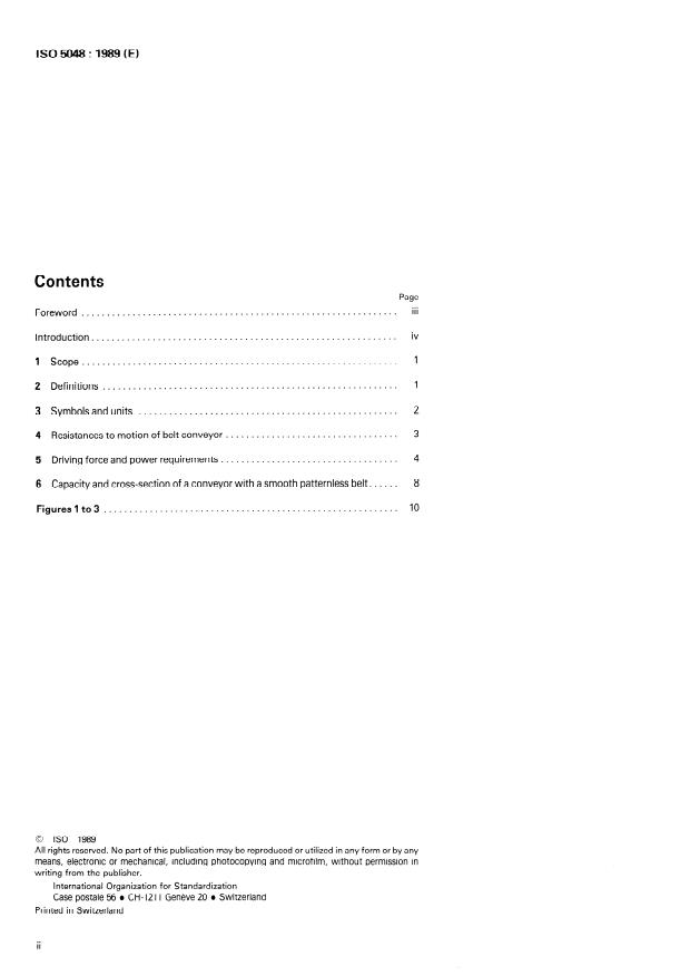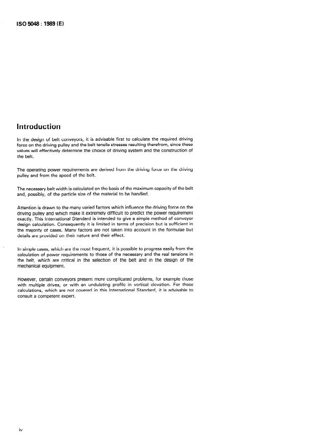 ISO 5048:1989 provides standardized methods for calculating the operating power required at the driving pulley of belt conveyors with carrying idlers, and for determining the tensile forces developed in the belt. It defines the required terms, symbols and units, classifies resistances to motion and gives formulae for driving force, power requirements, capacity and cross-section sizing for smooth, patternless belts. The standard targets conventional idler-conveyor systems and offers a practical (though not exhaustive) calculation method for design and specification.