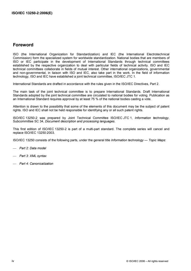 ISO/IEC 13250-2:2006 is a standard published by the International Organization for Standardization (ISO). Its full title is "Information technology - Topic Maps - Part 2: Data model". This standard covers: ISO/IEC 13250-2:2006 specifies the Topic Maps data model. It defines the abstract structure and interpretation of topic maps, the rules for merging topic maps and a set of fundamental subject identifiers. The purpose of the data model is to define the interpretation of the Topic Maps interchange syntax, and to serve as a foundation for the definition of supporting standards for canonicalization, querying, constraints, etc.
