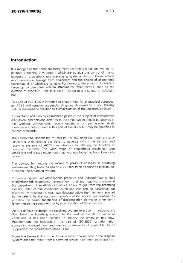 ISO 8835-3:1997 is a standard published by the International Organization for Standardization (ISO). Its full title is "Inhalational anaesthesia systems — Part 3: Anaesthetic gas scavenging systems — Transfer and receiving systems". This standard covers: Specifies requirements for transfer and receiving systems of active anaesthetic gas scavenging systems (AGSS) intended to reduce the exposure of hospital personnel to anaesthetic gases and vapours.