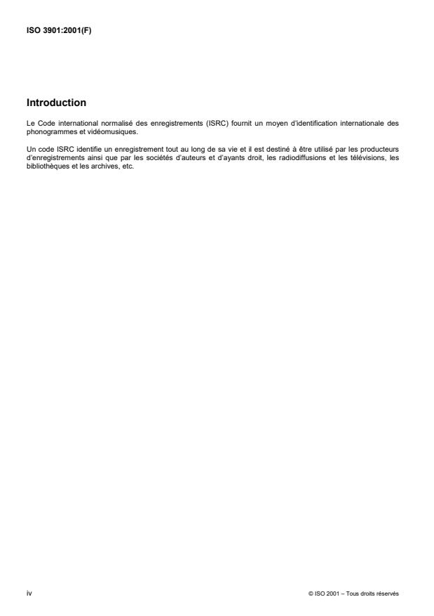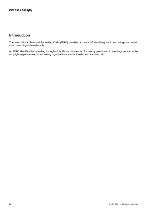 ISO 3901:2001 is a standard published by the International Organization for Standardization (ISO). Its full title is "Information and documentation — International Standard Recording Code (ISRC)". This standard covers: Information and documentation — International Standard Recording Code (ISRC)