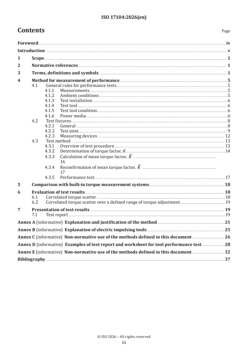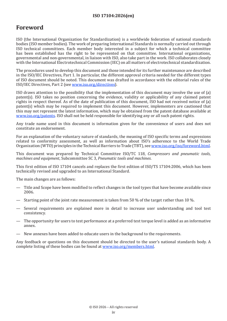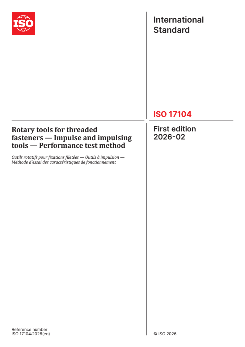 ISO 17104:2026 is a standard published by the International Organization for Standardization (ISO). Its full title is "Rotary tools for threaded fasteners — Impulse and impulsing tools — Performance test method". This standard covers: This document specifies a laboratory performance test method for hydraulic impulse and electric impulsing tools for installing threaded fasteners in a laboratory environment, and for power assembly tools (referred throughout the document as “tools”) for installing threaded fasteners. It gives instructions on the procedure, performance parameters to test and how to evaluate and present the test data. It also provides a method for the measurement of torque repeatability (scatter) over a range of torque rates as specified in this document, and over a range of torque adjustment as defined by the manufacturer. It gives instructions on equipment parameters, what to test for and how to evaluate and present the test data. It is applicable to tools of any power source, such as pneumatic or electric, including battery-powered, which apply torque in discontinuous increments, and within the torque range 0,5 N·m to 800 N·m. Outside this range, it is acceptable to modify the test method providing that the modification is documented in the test report. It is not applicable to impact wrenches, and ratchet wrenches or wrenches with ratcheting clutches. The relationship between torque measurements and clamp force-based tests is commented on in Annex A. The use of tools using discontinuous operation of the motor to provide torque impulses is discussed in Annex B. It requires manufacturers to perform tests over their defined torque range of the tool; however, it allows users to perform single point tests in order to minimize the number of test joints necessary for a wide range of test torque levels. A list of preferred test torque levels is provided in Annex C.