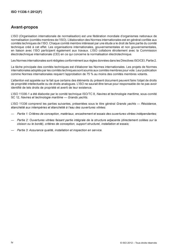 L'ISO 11336-1:2012 spécifie les exigences techniques applicables aux ouvertures vitrées indépendantes installées sur les grands yachts, en prenant en compte les conditions de navigation et l'emplacement de l'ouverture. Les grands yachts sont ceux dont la longueur de coque, LH, est supérieure ou égale à 24 m, et qui sont utilisés à des fins de sport, ou de loisirs et d'activités commerciales, avec une limitation de tonnage jusqu'a 3 000 tonneaux bruts, conformément à la Convention Internationale sur le jaugeage des navires. Les ouvertures et équipements de fermeture associés pris en compte par l'ISO 11336-1:2012 sont uniquement ceux qui sont situés au-dessus de la ligne de flottaison la plus enfoncée et qui sont critiques pour l'intégrité du navire pour ce qui concerne l'étanchéité aux intempéries et à l'eau, c'est‑à‑dire ceux qui pourraient entraîner l'entrée d'eau dans la coque en cas de rupture de la plaque. L'ISO 11336-1:2012 qui ne concerne de manière limitative que les ouvertures vitrées indépendantes.