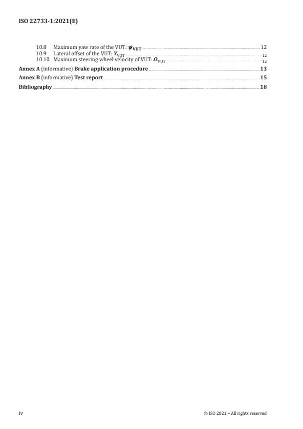 ISO 22733-1:2021 is a standard published by the International Organization for Standardization (ISO). Its full title is "Road vehicles — Test method to evaluate the performance of autonomous emergency braking systems — Part 1: Car-to-car". This standard covers: This document specifies a method to evaluate the behaviour of a vehicle equipped with an autonomous emergency braking system (AEBS), or dynamic brake support (DBS) during several accident scenarios. Those accidents occur during a straight-line driving when the vehicle under test (VUT) approaches another vehicle in the same lane. Both vehicles are aligned in longitudinal axis to each other. The most important part of the vehicle behaviour during these accidents scenarios is the capacity to avoid or mitigate the collision. Systems requiring driver intervention are not in the scope of this document. NOTE Depending on accidentology, only a part of the scenarios can be used for an evaluation of performance. AEB system evaluation based upon this document is limited to longitudinal accident scenarios.