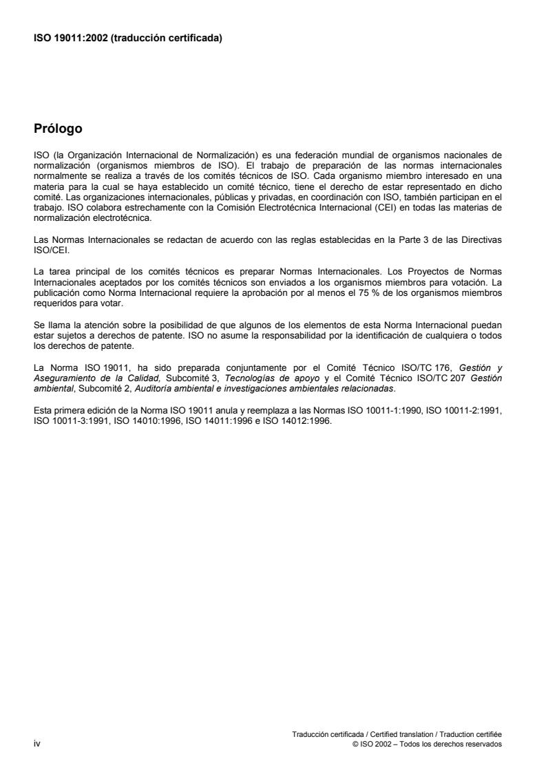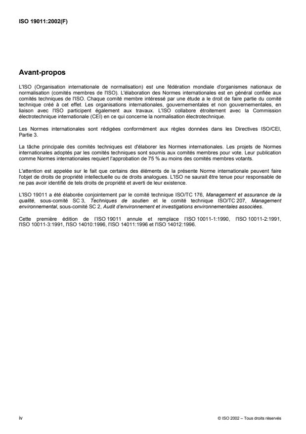 L'ISO 19011:2002 fournit des conseils sur les principes de l'audit, le management des programmes d'audit, la réalisation d'audits de systèmes de management de la qualité et/ou de management environnemental ainsi que sur la compétence des auditeurs de ces systèmes. Elle est applicable à tous les organismes qui doivent réaliser des audits internes ou externes de systèmes de management de la qualité et/ou de management environnemental ou manager un programme d'audit. L'ISO 19011 peut, en principe, s'appliquer à d'autres types d'audits, à condition toutefois d'accorder une attention particulière à l'identification des compétences requises pour les membres de ces équipes d'audit.